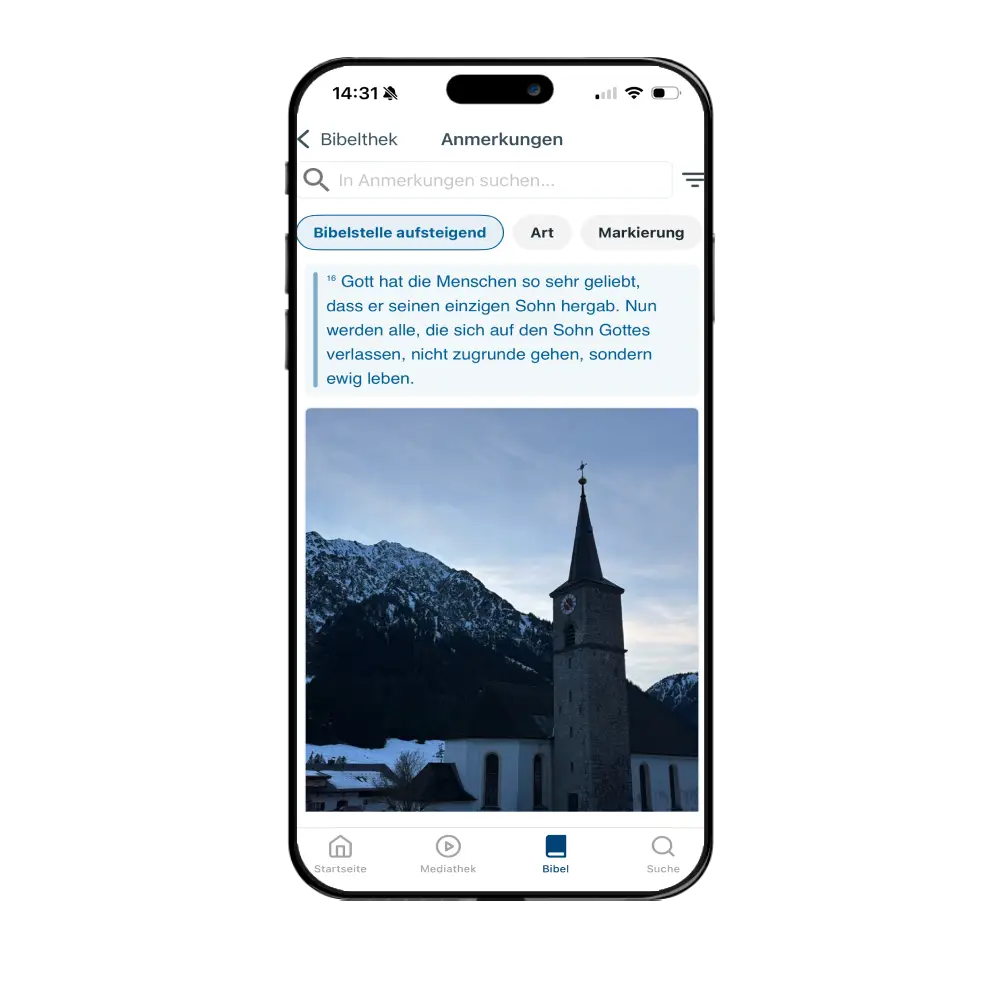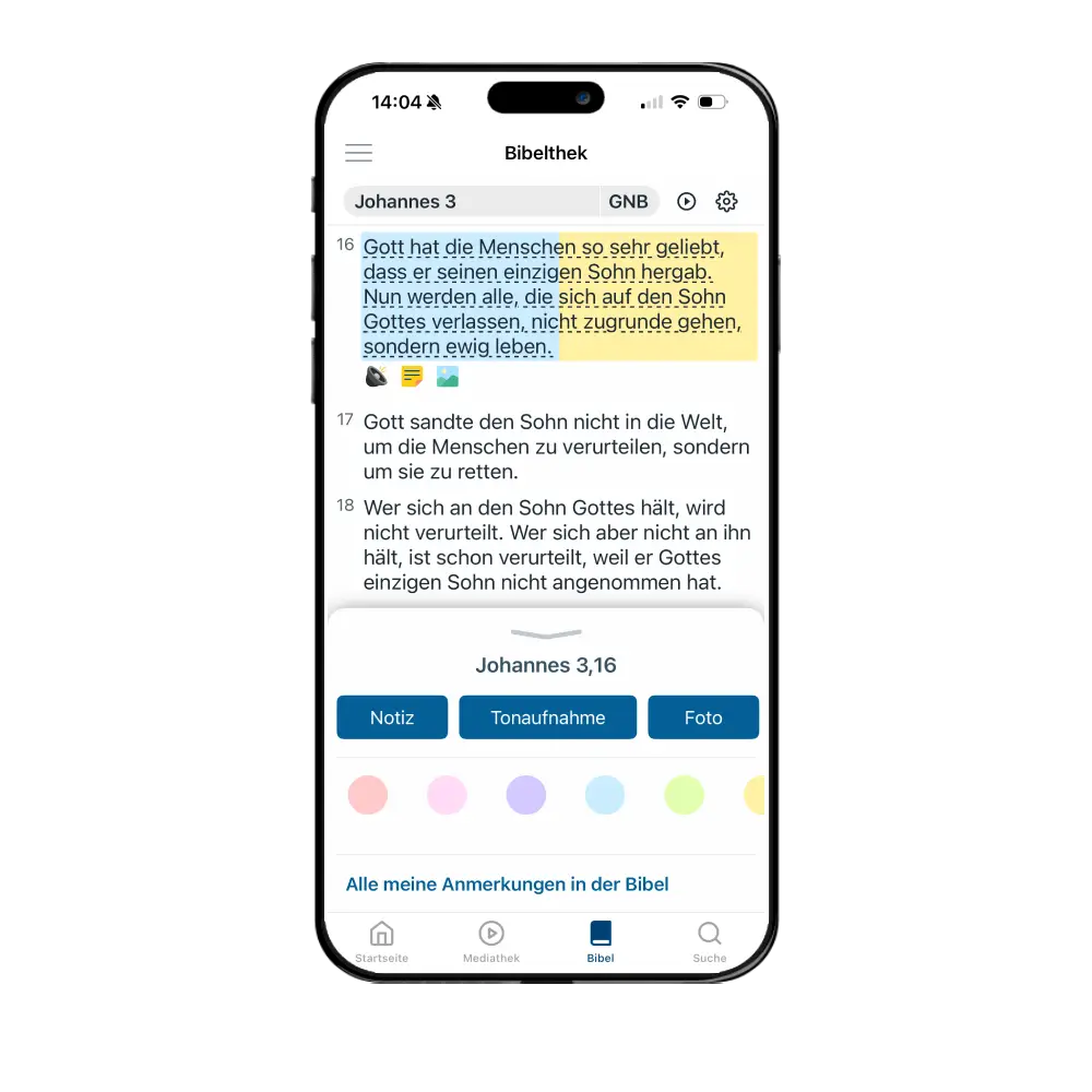 Gestalte dein Bibelstudium individuell – markiere Verse, schreibe Notizen, füge Fotos oder Tonaufnahmen hinzu und speichere alles dank unbegrenztem Speicherplatz sicher in deinem Account.
