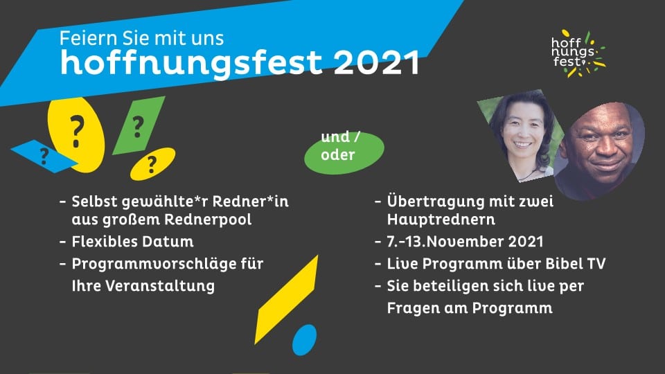 Die Feierlichkeiten gehen auch nach dem 7. Januar weiter: Über das ganze Jahr verteilt finden Veranstaltungen statt und zum Abschluss die hoffnungsfest-Übertragunswoche vom 7. - 13. November, die auch auf Bibel TV ausgestrahlt wird.