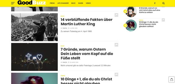 Titel wie “8 simple Ideen, wie du Obdachlosen helfen kannst” und „3 logische Fragen über Gott, die du kennen solltest“ erwarten Leser auf GoodBuzz.de. Die Plattform möchte unterhaltsame, positive und bereichernde Inhalte in die sozialen Netzwerke und damit in das Leben der jungen Generation bringen.